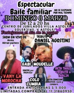 Este domingo desde las 12 y hasta las 20, el Centro de Jubilados de la localidad de Villa Astolfi (Soler 3145) será el escenario donde el distrito todo celebrará a las mujeres en su día.