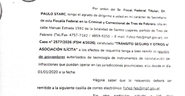 Puntualmente, la comunicación llegó al titular de la Subsecretaría de Política y Seguridad Vial de aquella cartera, Eduardo Feijó, en el marco de la causa 2577/2026, caratulada «Tránsito Seguro y otros s/ Asociación Ilícita», y requiere la remisión del «registro de proveedores autorizados de tecnología de instrumentos de constatación de infracciones que pueden operar en las jurisdicciones provinciales desde el 1 de enero del 2020 a la fecha».